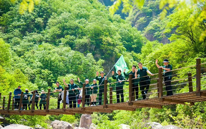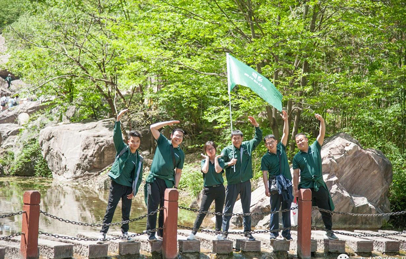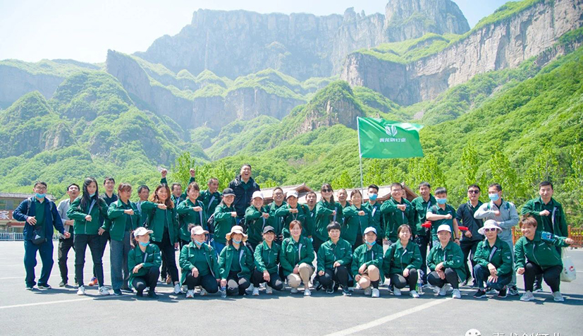 全體員工乘坐大巴赴河南八里溝景區(qū),團隊在山腳下合影留念!