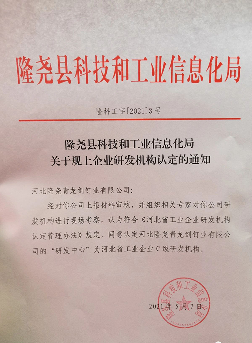 經(jīng)對(duì)你公司上報(bào)材料審核, 并組織相關(guān)專家對(duì)你公司研發(fā)機(jī)構(gòu)進(jìn)行現(xiàn)場(chǎng)考察, 認(rèn)為符合 《河北省工業(yè)企業(yè)研發(fā)機(jī)構(gòu)認(rèn)定管理辦法》規(guī)定,同意認(rèn)定河北隆堯青龍劍釘業(yè)有限公司的 "研發(fā)中心" 為河北省工業(yè)企業(yè)C 級(jí)研發(fā)機(jī)構(gòu)。