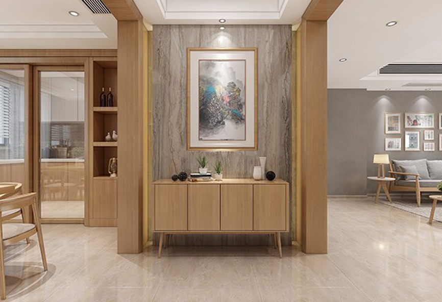 1、玄關通常與客廳或餐廳相連,但與廳的功能有區別,所以要通過裝飾設計進行功能分區。通常采用的方法主要是吊頂、墻面裝飾、地面的材料和色彩等區分或用門套、掛落、屏風、柜子等隔斷。玄關可以是一個封閉、半封閉或全開放的空間,與廳的關系是連而不直達、隔而不斷。
