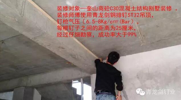 裝修工程隊使用青龍劍鋼排釘ST32對使用奎山商砼C30混凝土結(jié)構(gòu)的別墅進(jìn)行裝修吊頂 。(C30等級的混凝土幾乎可以適用于所有工業(yè)與民用建筑物、構(gòu)筑物的各種構(gòu)件)。