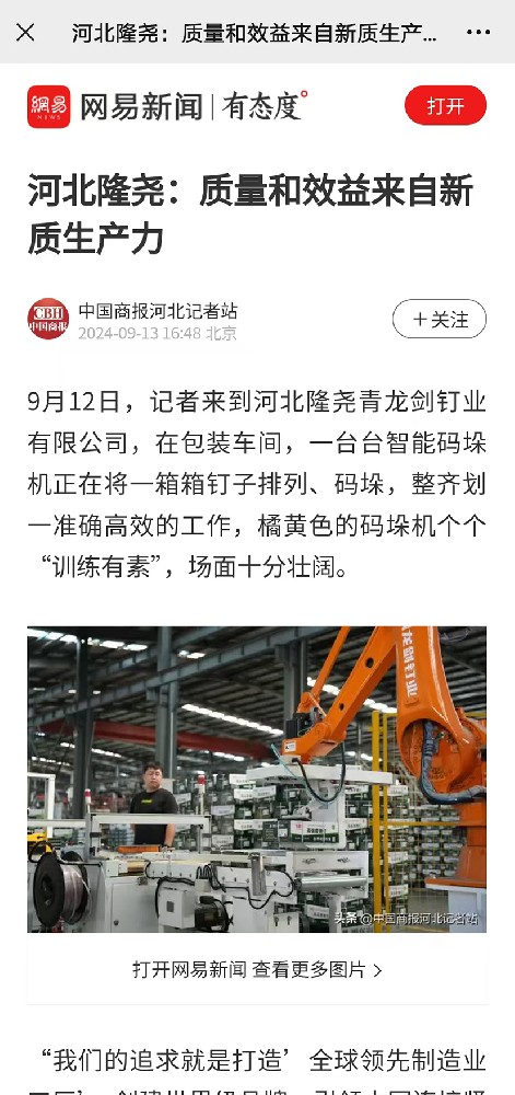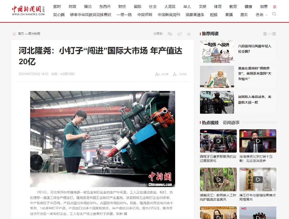 近日,中國新聞網記者走進河北隆堯青龍劍釘業有限公司,對制釘車間的生產工序及車間環境進行了解和拍攝。7月9日下午,青龍劍釘業榮登中國新聞網。青龍劍釘業將不斷探索、研發產品,通過技術升級、產品創新,為社會提供更高效、更安全緊固產品,提供更全面的基材連接緊固系統解決方案,樹立行業標桿,助力國家建設![詳情] 2024-07-19 14:26:03
